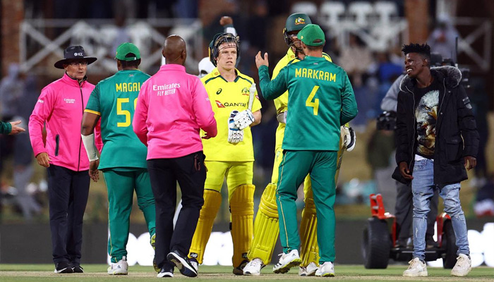 Marnus Labuschagne, man of the match in the previous two ODI’s which Australia won, was stumped off Shamsi’s bowling for 15 and David adjudged out despite substitute fielder Bjorn Fortuin looking unsure he had taken a clean catch of George Coetzee’s bowling. Television replays were also unconvincing.