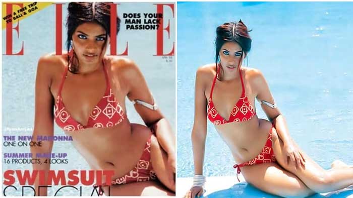 The cover captures peak ’90s fashion sensibility. Years before her Bollywood debut in Ajnabee, Bipasha brought a striking, athletic presence to Elle India’s swimsuit special.