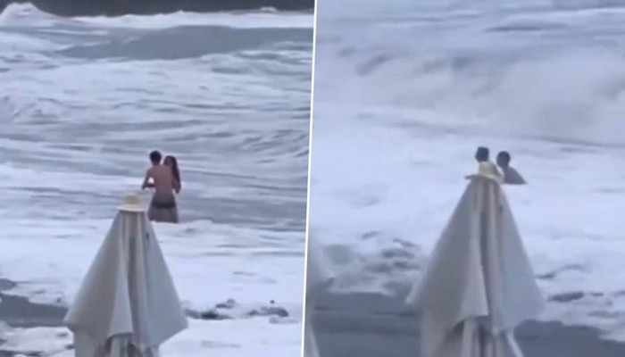 Thereafter, the wave current is seen knocking the couple down. Another massive wave then slams into the two. But, while the man is pushed towards the shore, the woman is swallowed by the sea.