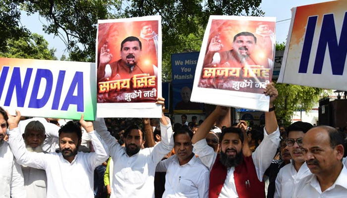 Ahead of his appearance in the court, Sanjay Singh said that his arrest is “Modiji’s injustice and he would lose the election”.