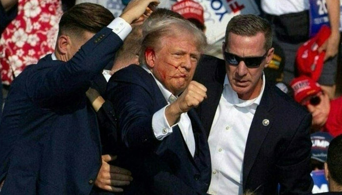 Secret Service agents swarmed onto the podium, surrounded the Republican candidate and escorted him roughly off the stage, as Trump raised a fist to the crowd in defiance.