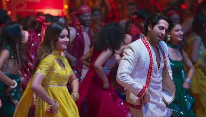 Naach is, even more, pulsating a dance number. It also has bits of Annu Kapoor grooving to English lyrics and a reference to the OG dancer with the words, “Govinda ban ja.” Ayushmann is seen in a sparkling silver kurta (Ranbir Kapoor from Dilli Wali Girlfriend, much), paired with a white pyjama and jacket with a red border. Ananya is seen wearing a bright yellow salwar suit in the song.