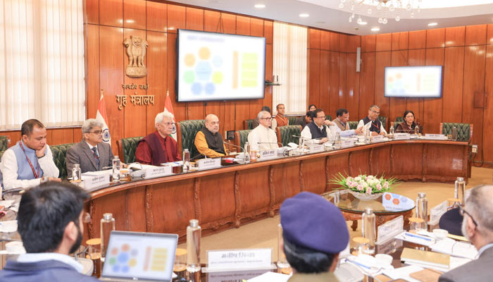 In the presence of Lieutenant Governor Manoj Sinha and Chief Minister Omar Abdullah, in New Delhi on Tuesday. The meeting reviewed the implementation and present status of various new provisions related to police, prisons, courts, prosecution, and forensics in Jammu and Kashmir.