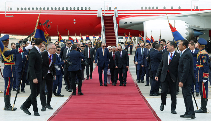 The countries mutually appointed ambassadors last year. This month Turkiye said it would provide Egypt with armed drones. El-Sisi greeted Erdogan as he emerged from his plane in Cairo with his wife and they conversed as they walked along a red carpet amid a fanfare, live television footage showed.