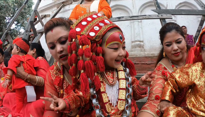 Kumari, a young girl who is revered by both Hindus and Buddhists in Nepal as a living goddess, left her temple palace and was driven around the center of the capital in a wooden chariot pulled by devotees, who lined up to receive her blessing. Among the spectators were President Ram Chandra Poudel, officials and diplomats.