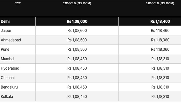 Gold prices on Tuesday surged over Rs 1,400 across India, fueled by global uncertainty and strong festival demand. In Mumbai, 24-carat gold was priced at Rs 1,18,310 per 10 grams, while 22-carat gold traded at Rs 1,08,450 per 10 grams. Silver also jumped Rs 1,000, reaching a record Rs 1,51,000 per kg.
