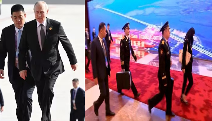 Rare footage was shown on Wednesday of Russian President Vladimir Putin in Beijing accompanied by officers carrying the so-called nuclear briefcase which can be used to order a nuclear strike.
