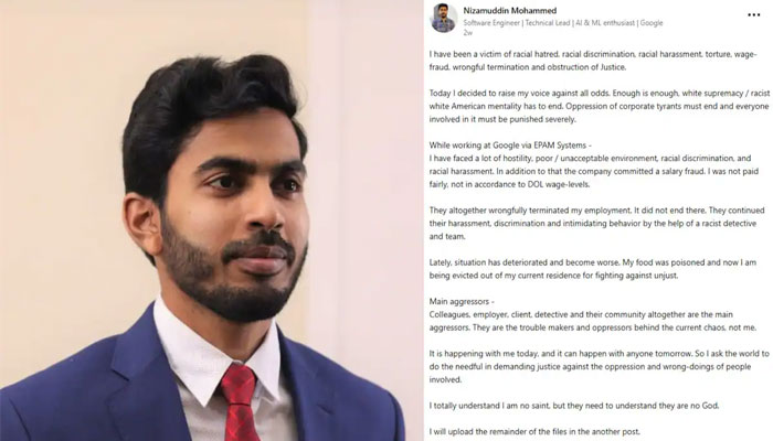 मौत से दो हफ्ते पहले निजामुद्दीन ने लिंक्डइन पोस्ट में नस्लीय उत्पीड़न, वेतन धोखाधड़ी और गलत तरीके से नौकरी से निकाले जाने की शिकायत की थी। उन्होंने “श्वेत वर्चस्व” और लगातार निगरानी जैसी बातों का भी ज़िक्र किया था। उनकी मौत के बाद यह पोस्ट सोशल मीडिया पर साझा की जा रही है।