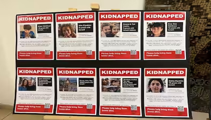 राष्ट्रीय राजधानी में इज़रायली दूतावास ने बुधवार को अपने नागरिकों के पोस्टर प्रदर्शित किए, जिनका 7 अक्टूबर के हमले के बाद हमास द्वारा अपहरण कर लिया गया है और बंधक बना लिया गया है.