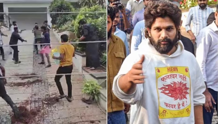 रविवार को हैदराबाद में तेलुगू सुपरस्टार अल्लू अर्जुन के घर पर प्रदर्शनकारियों ने हमला कर दिया। मीडिया रिपोर्ट्स के मुताबिक तोड़फोड़ के पीछे उस्मानिया यूनिवर्सिटी के प्रदर्शनकारियों का एक पैनल था। प्रदर्शनकारियों ने हैदराबाद के जुबली हिल्स इलाके में स्थित अल्लू अर्जुन के घर पर पत्थर और टमाटर फेंके। गमले भी तोड़े। कुछ प्रदर्शनकारियों ने घर में घुसने की कोशिश भी की। प्रदर्शनकारियों ने अल्लू अर्जुन से भगदड़ में मरने वाली 35 वर्षीय रेवती के परिवार को एक करोड़ रुपये मुआवजा देने को कहा।