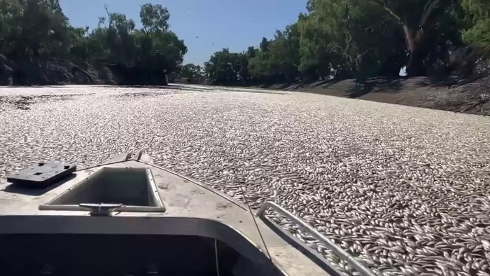 Videos posted to social media showed boats ploughing through a blanket of dead fish smothering the water, with the surface barely visible underneath.