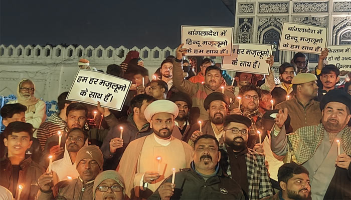 मुस्लिम शिया समुदाय के कई सदस्यों ने बांग्लादेश में हिंदू समुदाय के खिलाफ ‘अत्याचारों’ के खिलाफ उत्तर प्रदेश के लखनऊ में कैंडललाइट मार्च निकाला. शनिवार को लखनऊ के छोटा इमामबाड़ा में कैंडल मार्च निकाला गया. मार्च का नेतृत्व करने वाले मौलाना कल्बे जवाद ने केंद्र सरकार से बांग्लादेश में अल्पसंख्यकों के खिलाफ अत्याचारों का जायजा लेने के लिए संयुक्त राष्ट्र पर दबाव डालने और पाकिस्तान को ‘आतंकवादी देश’ घोषित करने का आग्रह किया.