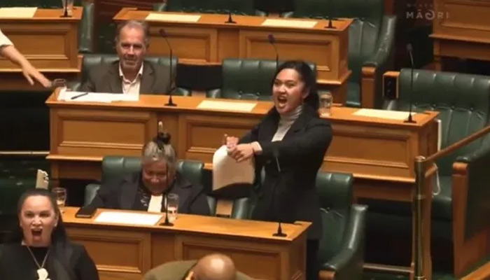 A viral video of the vote on the Treaty Principles Bill shows the 22-year-old Te Pati Maori MP interrupting the session by tearing apart a copy of the legislation before performing a haka. She is then joined by the people in the public gallery, prompting Speaker Gerry Brownlee to briefly suspend the House.