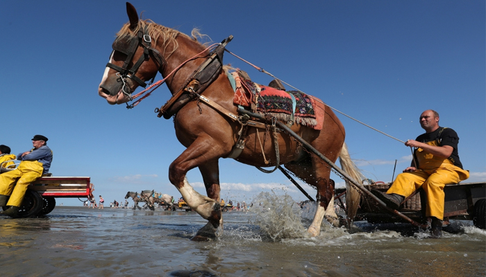 Back in the day, historians explain, poor farmers used to ride to the coast to fish — as a way to supplement their diet. At first they pulled their nets by hand, later using mules then eventually workhorses able to haul much larger, heavier loads. The method was used in Belgium, the Netherlands, northern France and the south of England.