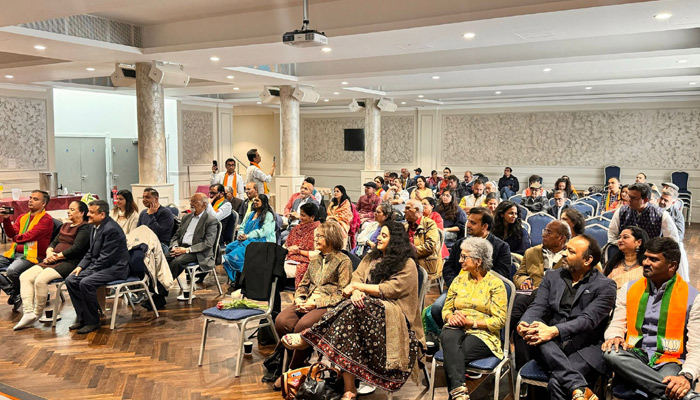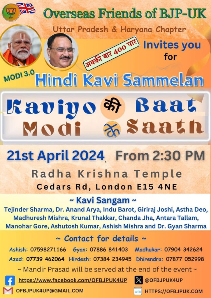 London, UK – April 21, 2024 – Overseas Friends of BJP UK (OFBJPUK) orchestrated a captivating ‘Kavi Sammelan’ on April 21st, 2024, at the Radha Krishna Temple in Stratford, London, UK.