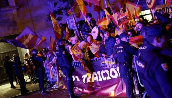 Spanish police on Monday night used batons to charge against a group of people protesting, some using fire flares, outside the ruling Socialist Party headquarters in Madrid against a proposed amnesty law related to Catalonia’s independence drive.