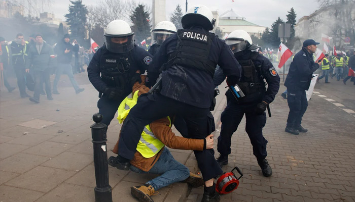 “Due to physical aggression against police officers by some of the people protesting … it was necessary to use direct coercive measures,” Warsaw police wrote in a post on X.