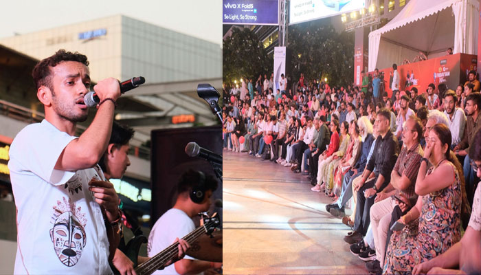Performing songs from his debut EP “Amour,” released earlier this year, Manthan delivered a captivating set, marking his third live show after appearances at Banaras Lit Fest and Kalinga Lit Fest in March 2025. He was joined on stage by Ankit Rawat (Drums), Rockin Sashna (Lead Guitar), Kshaunish Girdhar (Keyboard), and Gangmei (Bass).