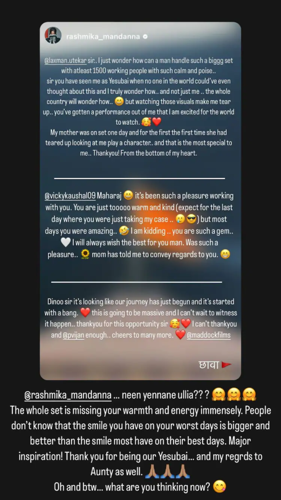 Rashmika Mandanna and Vicky Kaushal’s ‘Chhava’ is directed by Laxman Utekar. The ‘Animal’ actor took to her Instagram and drafted individual gratitude notes for the director, producer and the other cast. She also thanked Vicky Kaushal, with whom she will be sharing the screen for the first time.
