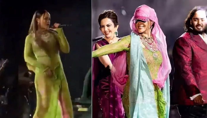 Wearing a fluorescent green bodycon and glittery gown, Rihanna was seen interacting with distinguished guests at Mukesh Ambani’s son’s pre-wedding event while performing on the stage. She also performed on her popular track ‘Work’.
