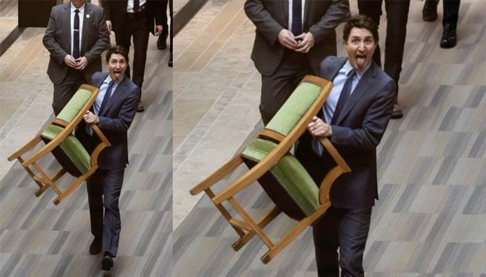 Former Canadian Prime Minister Justin Trudeau’s photo of exiting the parliament with his chair and his tongue sticking out has gone viral on social media.