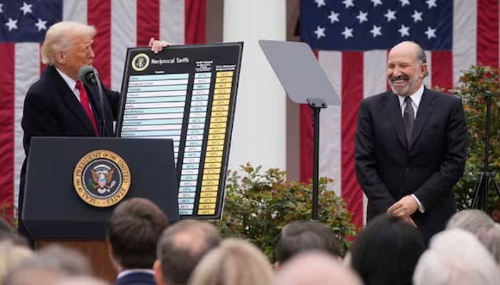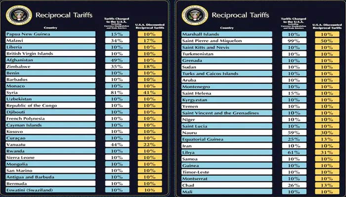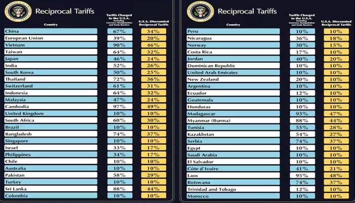 The US President said the United States will charge a 34 per cent tax on imports from China, a 20 per cent tax on imports from the European Union, 25 per cent on South Korea, 24 per cent on Japan and 32 per cent on Taiwan.