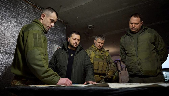 The Ukrainian leader, who has cancelled his upcoming foreign trips as the battlefield situation deteriorates, met wounded soldiers recovering at a medical facility and posed for photographs with troops at another location.