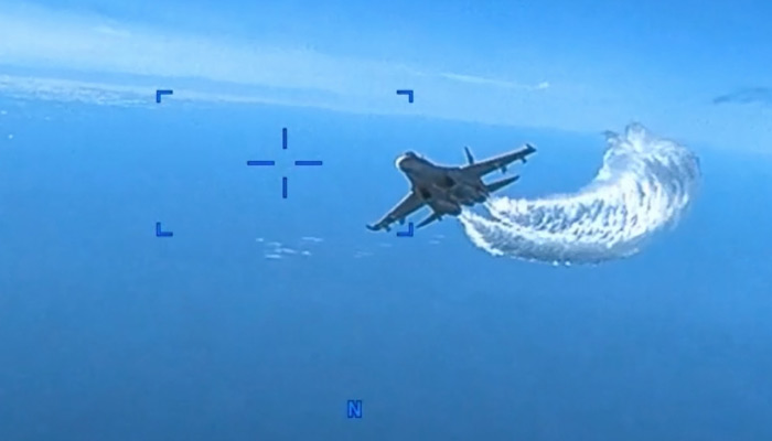 The video showed what the Pentagon said were two Russian Su-27 fighter jets swooping toward the drone and releasing jet fuel on it in harassing behaviour. After a second pass by the jets, the video cuts out then resumes with images of the drone’s damaged propeller.