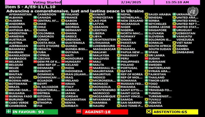 It called for “a de-escalation, an early cessation of hostilities and a peaceful resolution of the war against Ukraine”. Along with India, Argentina, the United Arab Emirates, China, and Iran also abstained from voting. Ukraine’s European allies expressed unanimous support for the US resolution, marking three years since Russia launched its full-scale invasion of Ukraine.