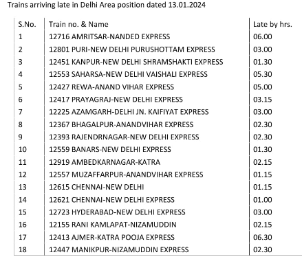 अधिकारियों का कहना है कि दृश्यता कम होने के कारण ट्रेनें धीमी गति से चल रही हैं। इस कारण अपने गंतव्य पर देरी से पहुंच रही हैं। शुक्रवार सुबह दिल्ली आने वाली लगभग 100 ट्रेनें देरी से चल रही हैं। देरी से गंतव्य पर पहुंचने के कारण उनके प्रस्थान समय में भी बदलाव करना पड़ रहा है।